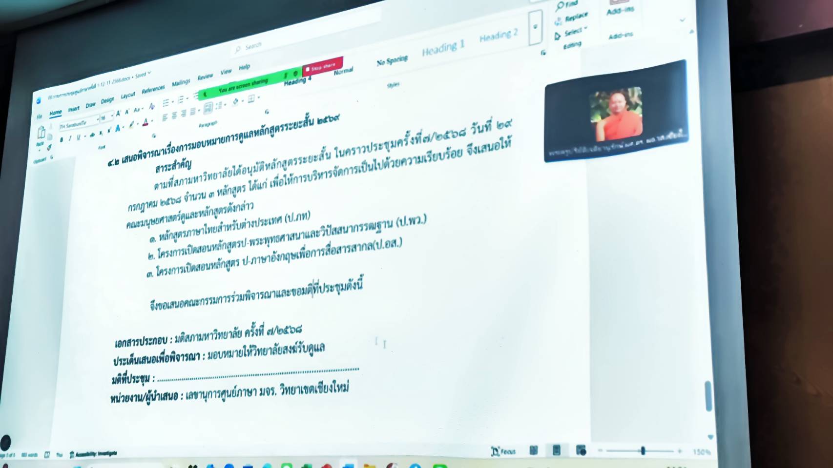 วันจันทร์ที่ ๑๗ พฤศจิกายน ๒๕๖๘ มหาวิทยาลัยมหาจุฬาลงกรณราชวิทยาลัย วิทยาเขตเชียงใหม่ จัดการประชุมคณะกรรมการศูนย์ภาษา ณ ห้องประชุมศรีปริยัตยานุรักษ์ อาคารวิทยบริการ พร้อมทั้งมีการประชุมแบบออนไลน์ผ่าน Zoom Meeting เพื่อให้คณาจารย์และบุคลากรจากหลายหน่วยงานสามารถเข้าร่วมได้อย่างสะดวกและทั่วถึง