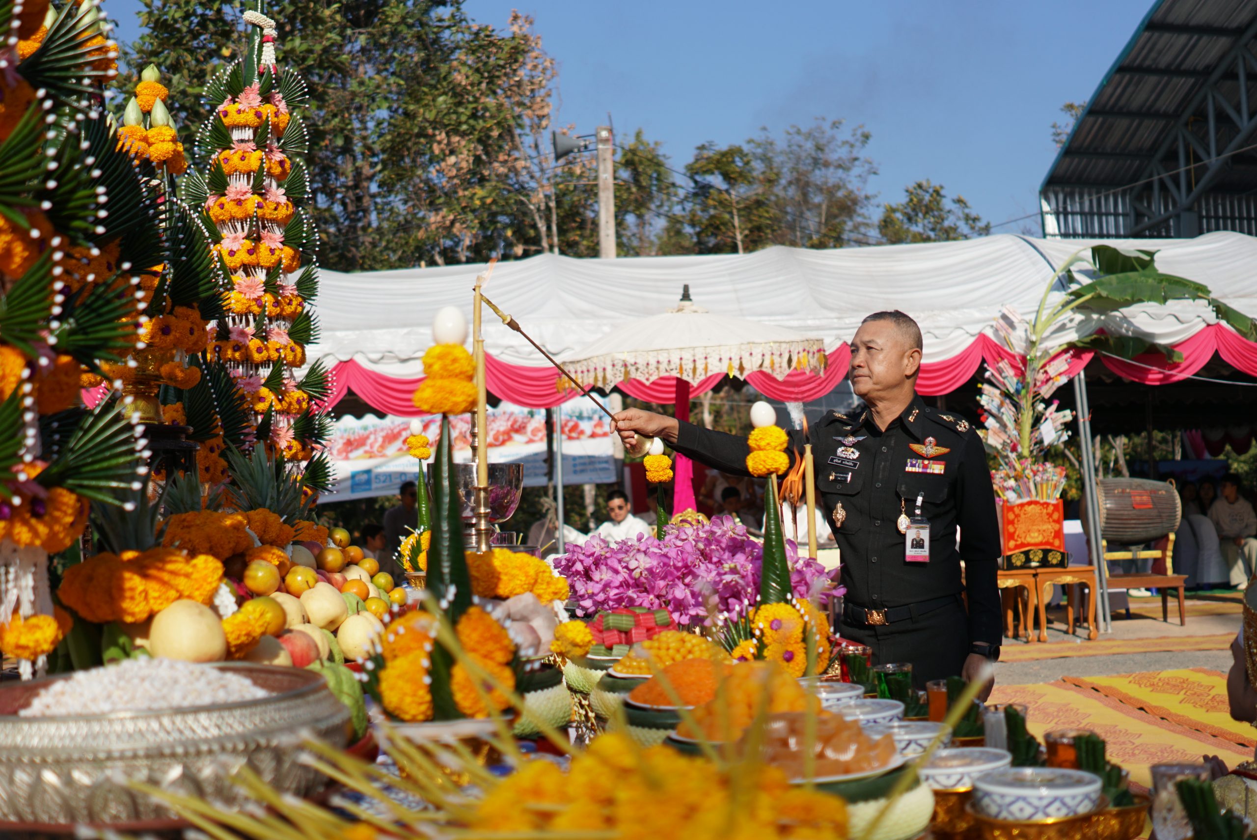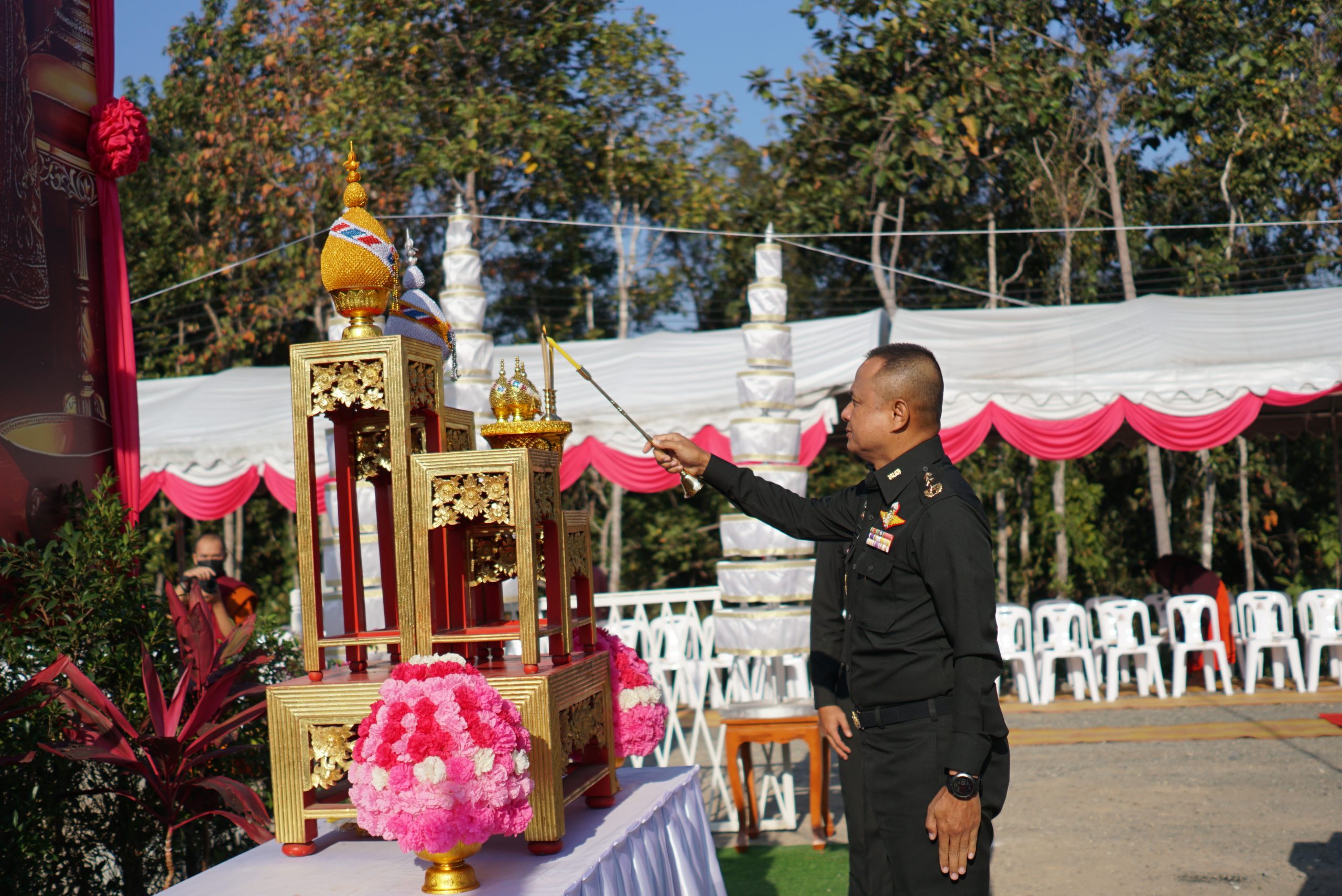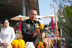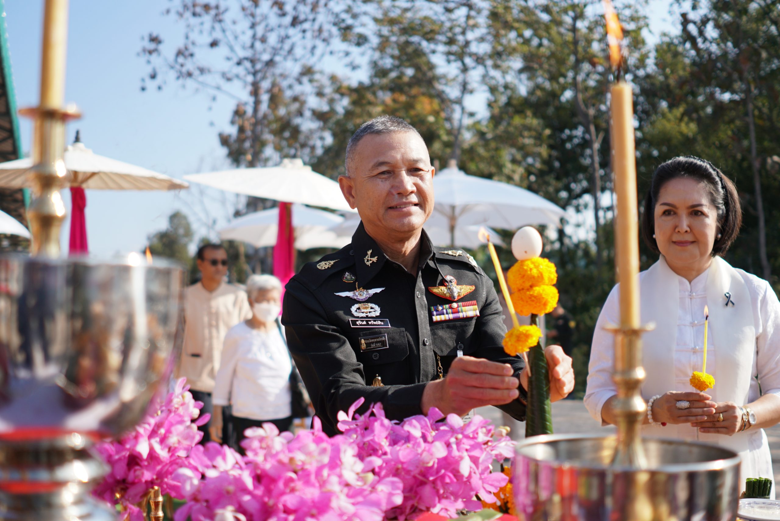 พิธีในครั้งนี้ได้รับความเมตตาจาก พระเดชพระคุณพระธรรมเสนาบดี ประธานสภาวิทยาเขตเชียงใหม่ และเจ้าคณะภาค ๗ ทำหน้าที่ประธานพิธีฝ่ายสงฆ์ โดยได้จุดธูปเทียนบูชาพระรัตนตรัย และนำกล่าวคำบูชาพระรัตนตรัย เพื่อความเป็นสิริมงคลแก่พิธี ขณะที่ พลโท ชายแดน กฤษณสุวรรณ แม่ทัพน้อยที่ ๓ ทำหน้าที่ประธานพิธีฝ่ายฆราวาส ได้จุดธูปเทียนเครื่องสักการะหน้าเครื่องบวงสรวง และ พลตรี สุจินต์ ทรัพย์สิน ผู้บัญชาการกองพลทหารราบที่ ๗ ได้จุดธูปเทียนเครื่องทองน้อยหน้าพระบรมฉายาลักษณ์ พระบาทสมเด็จพระจุลจอมเกล้าเจ้าอยู่หัว รัชกาลที่ ๕