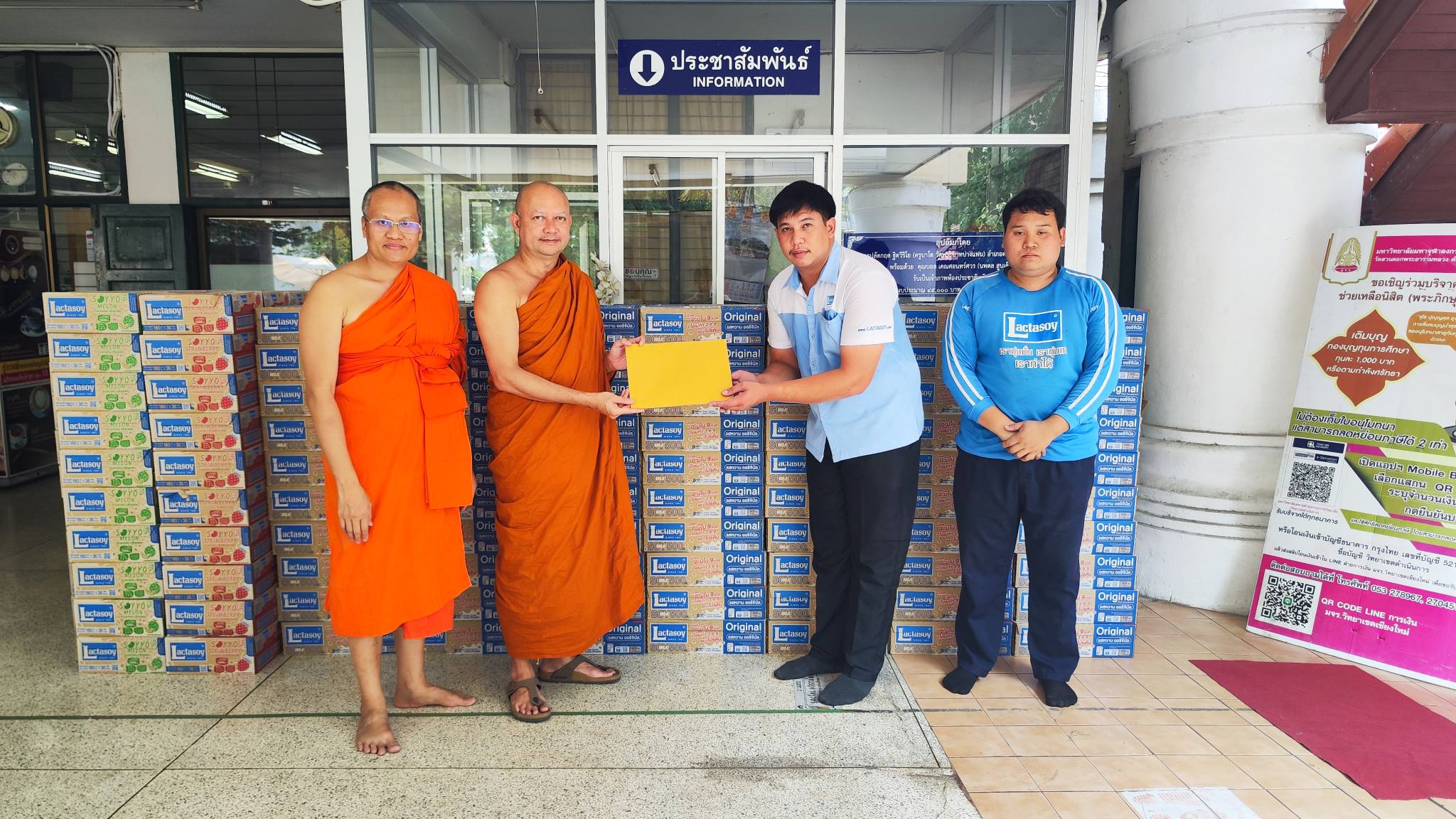 วันพฤหัสบดีที่ 23 เมษายน 2569 บริษัท แลคตาซอย จำกัด (สาขาเชียงใหม่) ได้แสดงความห่วงใยและร่วมสนับสนุนภารกิจด้านการศึกษาและสาธารณประโยชน์ ด้วยการมอบนมกล่องจำนวน 500 กล่อง ให้แก่ มหาวิทยาลัยมหาจุฬาลงกรณราชวิทยาลัย วิทยาเขตเชียงใหม่ เพื่อใช้ประโยชน์ในกิจกรรมของมหาวิทยาลัย และสนับสนุนการดูแลนิสิต บุคลากร ตลอดจนงานด้านสาธารณสงเคราะห์ต่าง ๆ ของสถาบัน